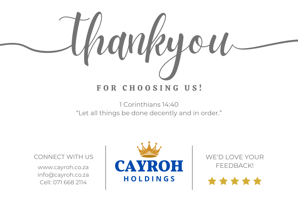 We would like to sincerely thank all our existing clients for your continued trust and support—it is truly appreciated. Your confidence in our service motivates us to maintain the highest standards every day. To our future clients, we look forward to working with you and delivering the same level of professionalism, reliability, and attention to detail that defines Cayroh Cleaning Solutions.